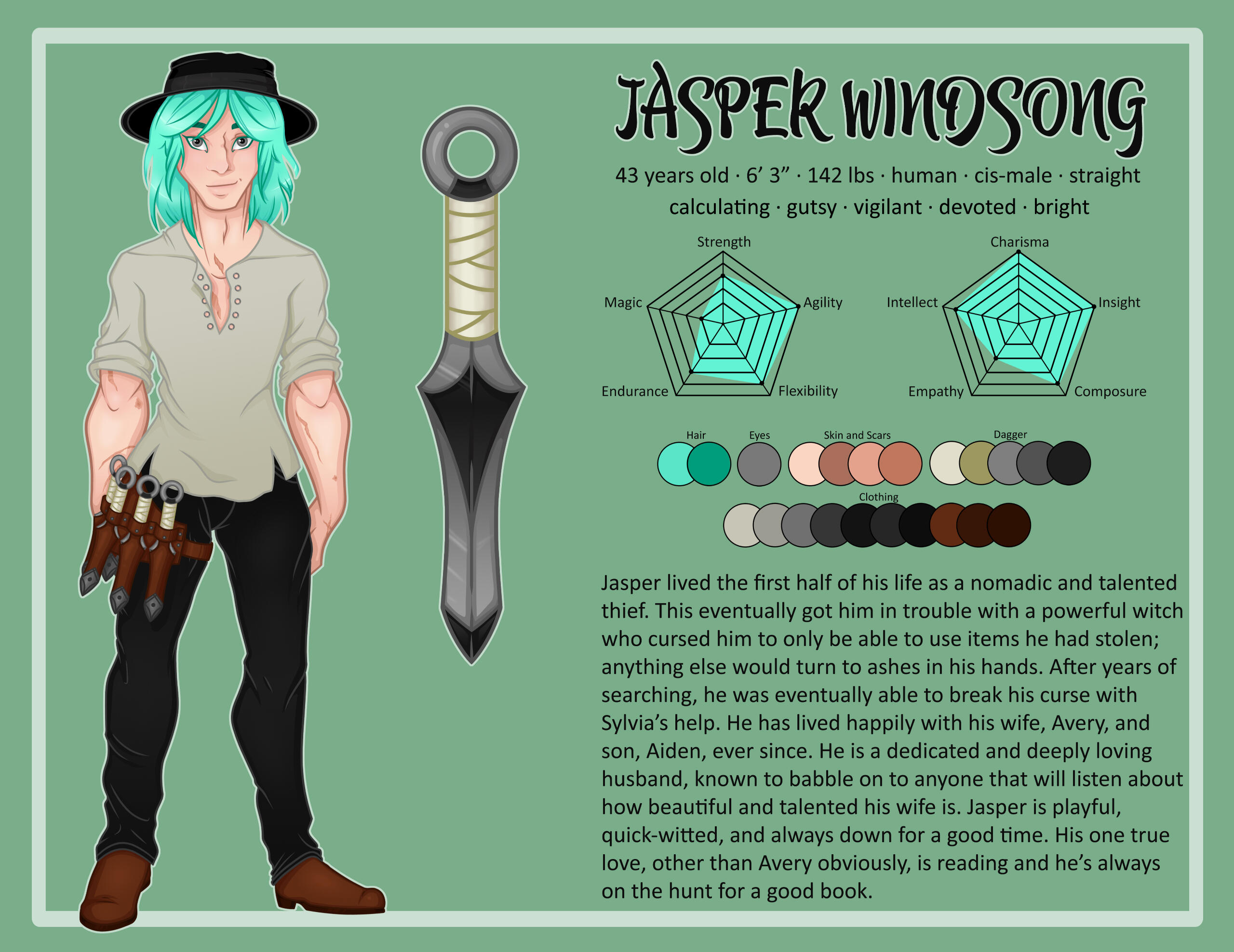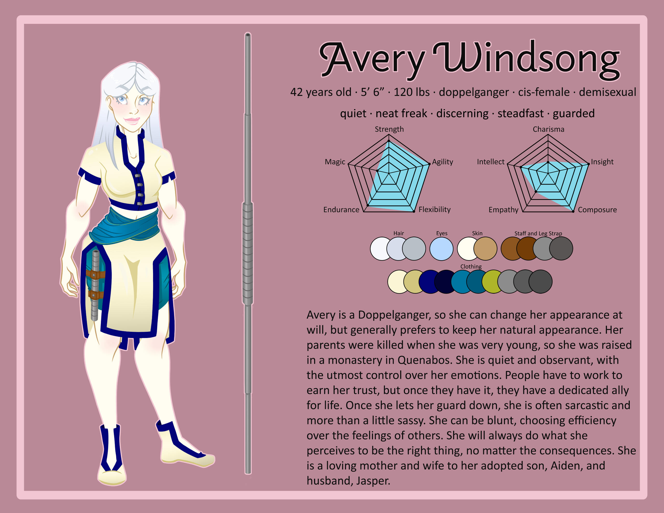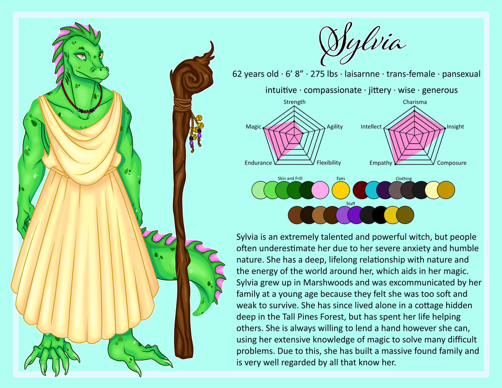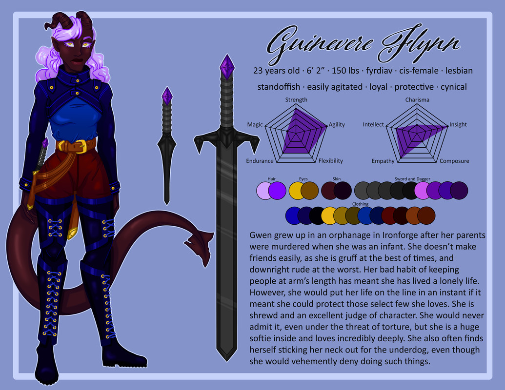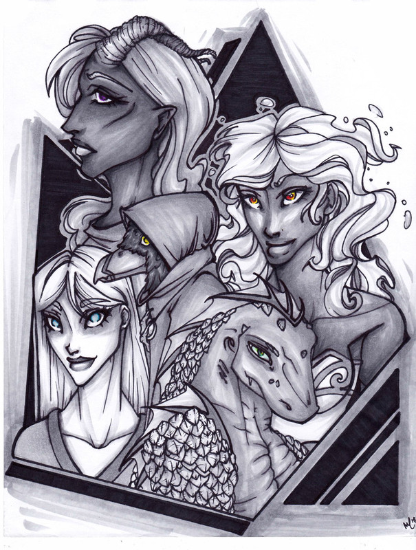 This is also a very early work, before Myev or Ivy existed. I don't love the way Veda looks (I hadn't yet figured out how I really wanted her to look), but I do enjoy Avery and Sylvia here (though in Sylvia's final design I decided to ditch the scales, mostly for my sanity's sake). Keen eyes may also notice that I reused this image of Gwen for the book's cover!