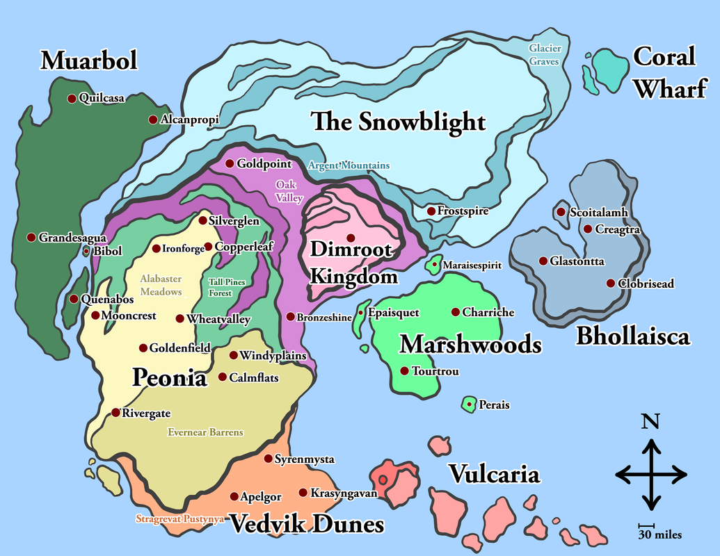 Due to being the largest and most industrialized country in Engadi, Peonia has many cities and towns. Some of the most well-known are the following:Bronzeshine: A city at the southern end of Oak Valley, known mostly for bronze mining and the agricultural work they do in the Valley.Calmflats: A tourist city in the midst of the Evernear Barrens. The town gets its name from the sheer contrast with the town to the north of them, Windyplains. Despite being mostly surrounded by savanna, Calmflats is a haven of carefully tended flora, turning the city into a colorful reprieve from the drier and harsher lands around them. The people of Calmflats have taken their reputation as an oasis to heart and multiplied it by cultivating a high-class spa treatment industry.Copperleaf: A copper mining community near Silverglen.Goldenfield: An agricultural township that, along with their sister town of Wheatvalley, use the plentiful land around them to provide much of the food for Peonia.Goldpoint: A rich community bolstered by nearby gold mining in the Argent Mountains. Most of The Council lives there.Ironforge: An industrial city filled with factories. Most of the country’s resources are processed and made into goods there, using the poor people of the city as an easily exploited workforce.Mooncrest: A seaside tourist town known for the cliffs that surround the city, which are filled with glittering moonstone.Rivergate: A town at the southern end of the White River that separates the Alabaster Meadows from the Evernear Barrens. The people of this town largely man a hydropower plant there. While the majority of the citizens in Peonia still live by candlelight, the richest members of Peonian society have integrated electricity into their homes thanks to various plants placed along the river. The hydropower plants are also used to power the manufacturing plants in places such as Ironforge.Silverglen: A proud intellectual community nestled at the base of the Argent Mountains. Silverglen is known far and wide for their extensive libraries and colleges, many of which specialize in spell work.Wheatvalley: An agricultural town at the edge of the Tall Pines Forest where it turns into the Alabaster Meadows. They work side by side with Goldenfield to provide food for Peonia.Windyplains: A small town at the northern end of the Evernear Barrens known for the extreme winds that rip through the land, making it difficult for the residents to grow crops or build tall structures because the winds just rip them down. Residents believe that the settlers of the town were cursed centuries ago by a spiteful witch.Other locations include the Argent Mountains, Tall Pines Forest, the Alabaster Meadows, the Evernear Barrens, and Oak Valley.